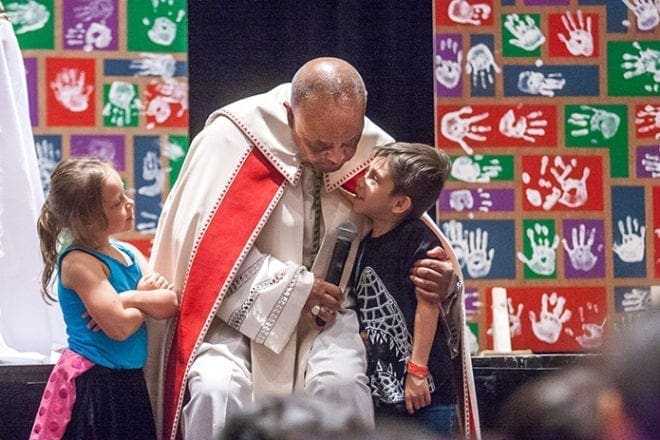 Archbishop Wilton D. Gregory visits the children’s track on Saturday during the congress. He said that visiting with the children is one of the highlights of the event for him. Here he talks to Abigail French, age 5, left, and Jayden Limon, age 7. Photo by Thomas Spink