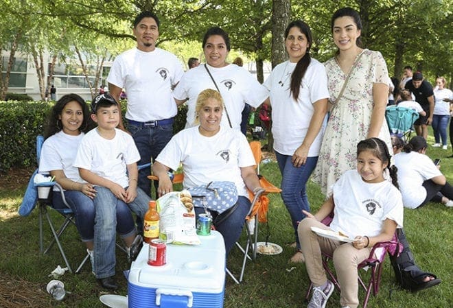 Members of the “Guadalupanos cominando en la fe” (Guadalupanos walking in faith) community from St. John the Evangelist Church break for lunch in the shade outside the Georgia International Convention Center. They were joined by other faith communities within the Hapeville parish. Photo By Michael Alexander