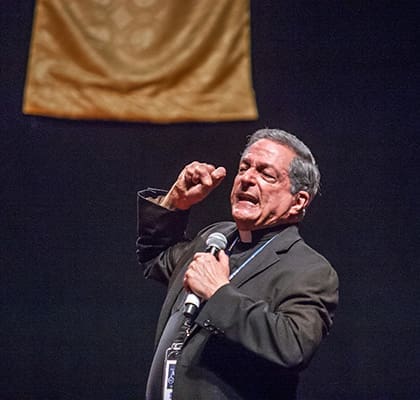 Father Pedro Núñez, the final speaker in the Spanish track at the congress, is a well-known preacher in the Catholic Spanish-speaking world. His passionate talk on the love of God and the gift of the Eucharist brought fervent “amens” from the crowded hall. Photo by Thomas Spink