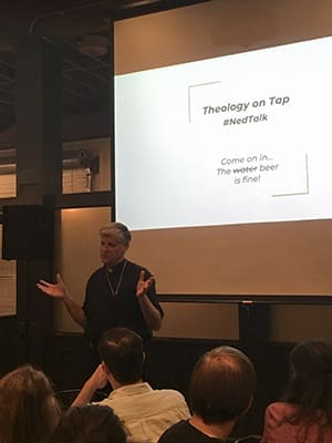 But on this balmy Wednesday evening, Fields was joined by more than 100 young adults. They sipped on hops, ate Cuban sandwiches and bowls from Zun Zun and listened intently to Bishop Shlesinger’s #NedTalk—whether crowded in the brewery or relaxing outside where speakers piped the bishop’s words into the evening air.