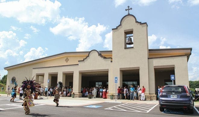 Members of the Anza Azteca Dancers from St. Matthew Church, Winder, perform in front of the St. Bernadette Parish Center, Cedartown, following its June 24 Mass of blessing and dedication. Photo By Michael Alexander