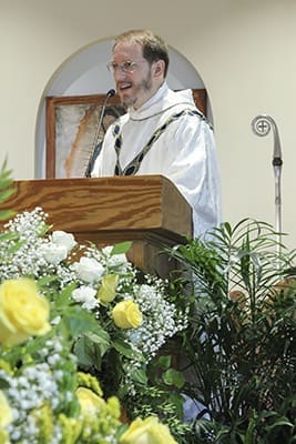 Father Timothy Gallagher, pastor of St. Bernadette Church, Cedartown, provides some closing remarks in the way of gratitude and appreciation for those who made the new St. Bernadette Parish Center possible. Photo By Michael Alexander