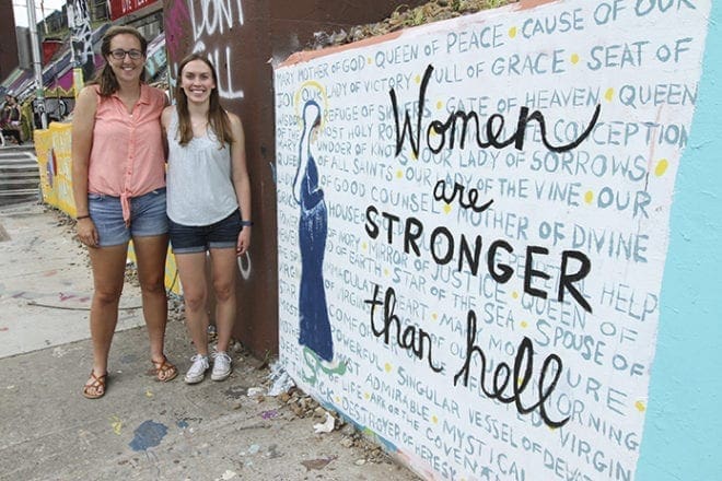 The two 20-something artists hope their mural painting spurs an understanding of Catholicism and feminism. It sits between a spray-painted warning not to call the police and a night club party.