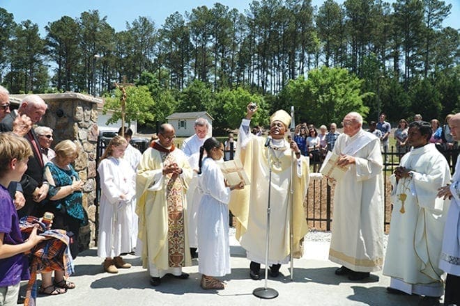 Archbishop Wilton D. Gregory, right center, celebrated Mass and blessed the new columbarium and memorial garden May 13 at St. Oliver Plunkett Church. Among those on hand to mark the occasion were the pastor, Father Cyriac Mattathilanickal, MS, left center, and many of the Snellville church’s parishioners.