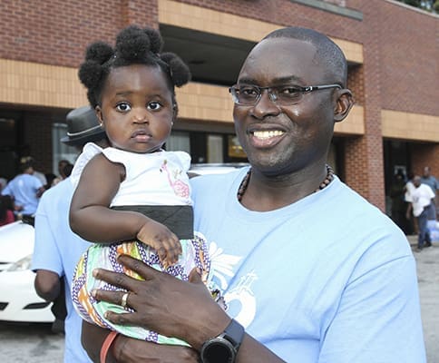Ogis Gomez of St. Oliver Plunkett Church, Snellville, and his nine-month-old daughter, Desia, celebrated the 25th anniversary of the Gambia Christians Organization of Atlanta with fellow Gambians during the family picnic, the organization’s final celebratory event of the weekend. Photo By Michael Alexander