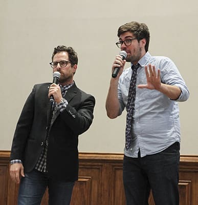 Joseph Lemmo, left, and Parker Patzke, perform a comedic skit during the 13th Annual Dinner Auction at St. Michael the Archangel Church, Woodstock. They were spoofing the proper way to bid at an auction. Patzke is one of Lemmo’s two partners in his Catholic improv group. The other one, not pictured, is Topher Warren. Photo By Michael Alexander