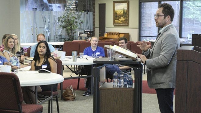 Joseph Lemmo occasionally teaches a Joy-Filled Marriage session, the archdiocesan-sponsored marriage prep program offered at the Chancery. This particular session took place on Aug. 18. Lemmo and his wife, Justine, members of St. Michael the Archangel Church, Woodstock, will celebrate their fifth wedding anniversary Nov. 23. Photo By Michael Alexander