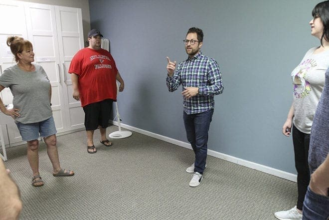 Joseph Lemmo, right center, joins improv students (l-r) Debbie Veith, Scott Bagwell and Cheryl Crutchfield during a warm up with exercises meant to get them thinking and connecting ideas. Lemmo teaches an adult improv class on Wednesday nights at the Elm Street Cultural Arts Village in downtown Woodstock. Photo By Michael Alexander