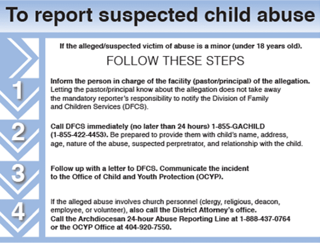 If a child tells an abuse account to an adult or someone close to a victim reports abuse, that’s when mandatory reporters are required to report to DFCS at 1-855-GACHILD. The report should also be made immediately to the supervisor of the parish or school.
