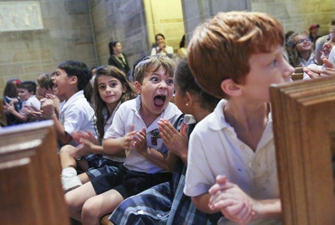 After it was announced that students would receive Popsicles upon leaving the Cathedral of Christ the King and they would not have to wear uniforms for the remainder of the week, Christ the King School first-grader Richard Robbins, center, was not alone in expressing his excitement. Photo By Michael Alexander