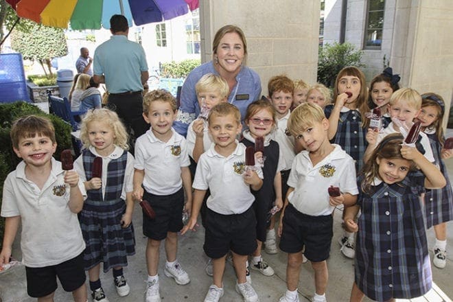 During the celebration that followed the announcement of Christ the King School, Atlanta, as a National Blue Ribbon School of Excellence, Katie Callahan, background center, and her kindergarten class, along with the entire school, were treated to King of Pops Popsicles. Photo By Michael Alexander