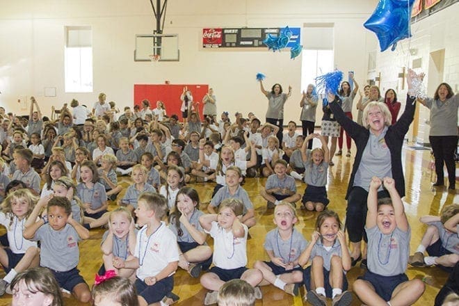 Students and teachers at Holy Redeemer School celebrate with gusto at the announcement of the school’s second Blue Ribbon School designation. The U.S. Department of Education named the Johns Creek school a national School of Excellence Oct. 1.