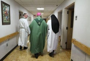 After Mass during a January 2017 visit, Archbishop Wilton D. Gregory, center, joins Our Lady of Perpetual Help Home chaplain, Father Paul Burke, left, and Sister Mary Damien, right, as they walk around greeting patients at the Atlanta home. Photo By Michael Alexander