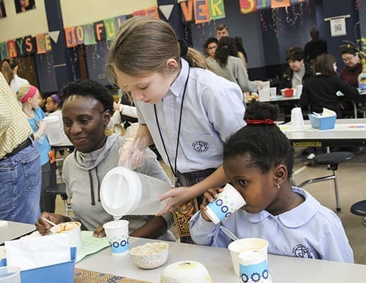 St. Thomas More School fourth-grader Evelyn Ballew pours some water for Gillian Beckford, third from right, as her daughter Abigail, far right, a kindergarten student, drinks from her cup. Students took turns serving in shifts throughout the Empty Bowls Dinner. Photo By Michael Alexander