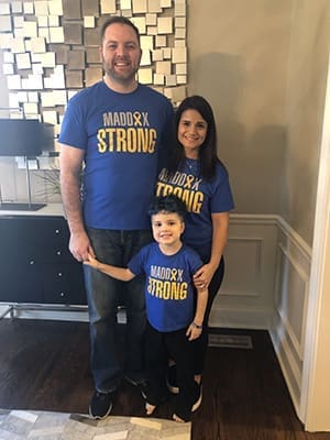 Dr. Nicholas and Nour Kelly with their son, Maddox. The family is wearing their Maddox Strong t-shirts worn by St. Jude the Apostle students to show solidarity with the boy in his fight against leukemia.