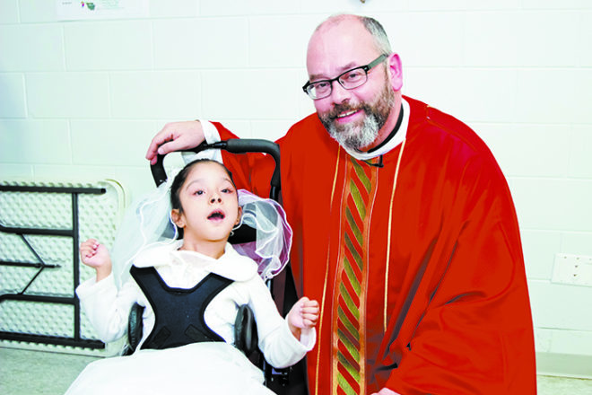 Brittany Castro-Delgado, 8, and Father Paul Moreau celebrate her first holy Communion at St. Joseph Church, Athens, in March. It was getting to know Brittany that gave the pastor the idea to launch a faith formation program to serve families of children with disabilities. Photo by Sally Gustafson