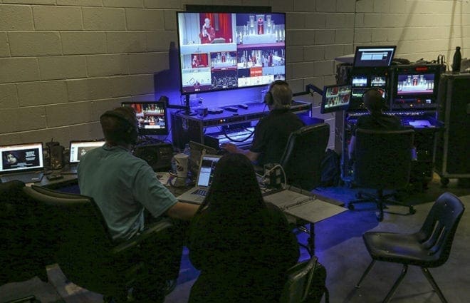 In the area behind the altar and staging, members of the Atlanta Archdiocese, JJA Project Management and its video partner, One Hart Live, handle video operation and graphics. They control everything that goes up on the video screens viewed by Eucharistic Congress participants, including the cameras, video playback, presentations, graphics, titles, etc. Photo By Michael Alexander
