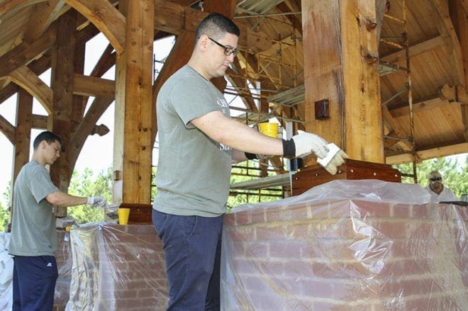 Deacon Cristian Cossio stains one of the columns at the Martin Gatins Chapel on the natural burial grounds of the Monastery of the Holy Spirit’s Honey Creek Woodlands, Conyers. In the background seminarian Patrick Lamar is performing the same job. Photo By Michael Alexander