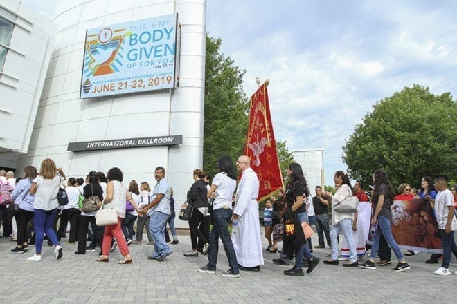 As the logo and theme for the 24th annual Eucharistic Congress appear on the marquee above, the morning procession makes its way into the Georgia International Convention Center, College Park, June 22. Photo By Michael Alexander