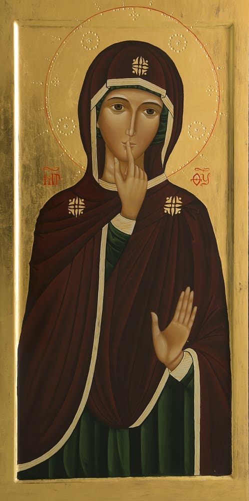 Near the elevators people take to reach the papal study or meeting halls, the pope hung a copy of the icon of Our Lady of Silence—an image of Mary with her index finger poised gently in front of her closed lips.