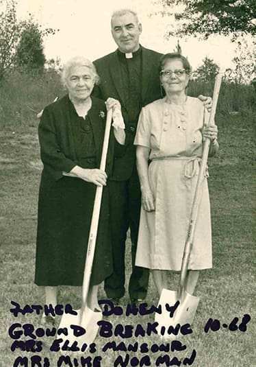 Father Luke Doheny, CSSR, is photographed with Mrs. Ellis Mansour and Mrs. Mike Norman at the groundbreaking of St. George Church on its Roscoe Road property in Newnan in 1968.