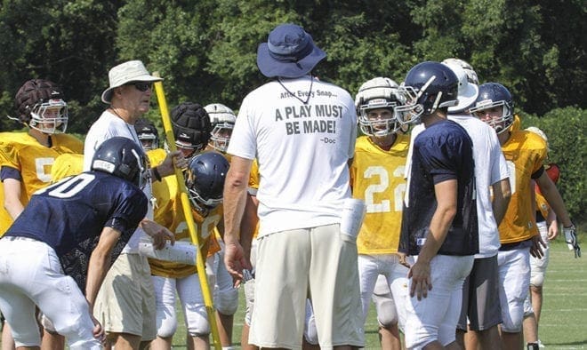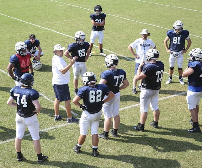 During football camp in August, Alan Chadwick, left, with white hat and T-shirt, head football coach at Marist School, Atlanta, listens in as the team’s offensive coordinator and quarterback coach, Paul Etheridge, back to camera, goes over the execution of a play with some of the offensive players. This marks Chadwick’s 44th year of coaching football at Marist. He was an assistant coach under his predecessor, the late Dean Hargis, for nine years, and he’s been the head coach for 35 years. Photo By Michael Alexander