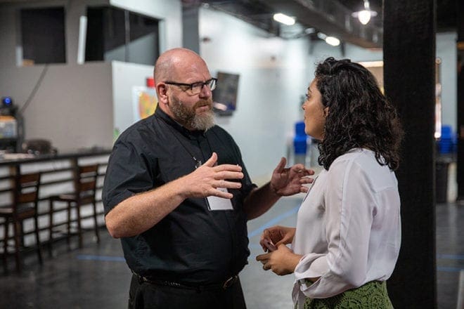 Father Victor Galier, pastor of St. Anthony of Padua Church, Atlanta, speaks with Michelle Nuñez at the Humanitarian Respite Center in McAllen, Texas during a Sept. 16-18 Catholic Extension Mission Immersion trip to the border of the United States with Mexico. Photo by Rich Kalonick/Catholic Extension