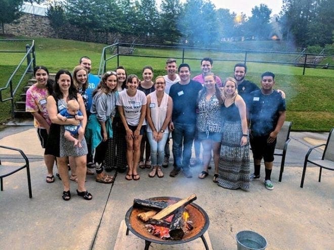 Members of Ignite at St. Benedict young adult ministry pose for a picture at a 2018 summer bonfire event. The ministry is based at St. Benedict Church, Johns Creek.