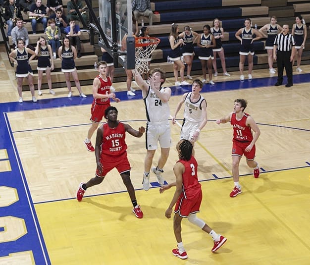 During the second half of the Jan. 14 game, St. Pius X High School senior Tucker Kelly (#24) goes up for a layup over the Madison County defense. St. Pius X defeated Madison County 77-42. Photo By Michael Alexander