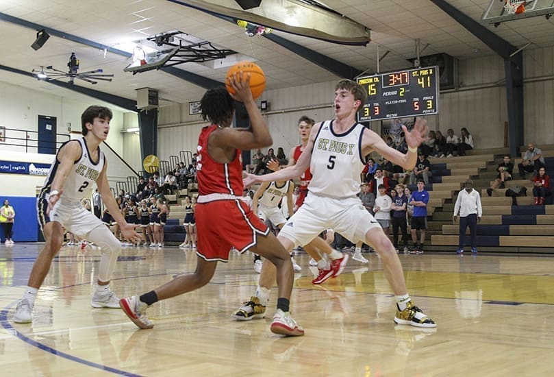 ATLANTA—The St. Pius X High School boys’ basketball team started the Jan. 14 game with an 11-0 run, forcing Danielsville’s Madison County High School to call an early time out. It didn’t matter. St. Pius X players kept their foot on the gas, enforced a tenacious defense and defeated Madison County 77-42.