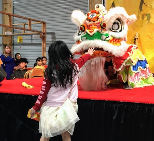 A girl pets the lion during the Jan. 26 Vietnamese New Year celebration, commonly known as Tết, at Our Lady of Vietnam Church, Riverdale. Photo By Andrew Nelson