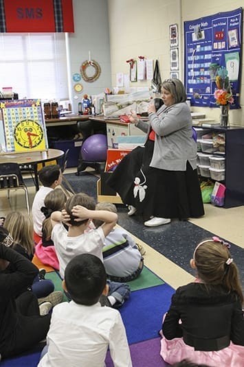Wearing a poodle skirt on “50s Day” at St. Mary’s School, Rome, Beth Abbott reads Betsy Maestro’s “Snow Day” to her kindergarten class of 22 students. She has resided in Rome since her freshman year in high school. Abbott is also a graduate of the city’s Berry College. Photo By Michael Alexander