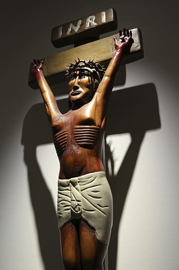 The art isn’t typical in depicting this popular Lenten devotion. There are two overtly religious themed pieces included—the 1650 oil painting by Nicolas Tournier of Peter denying Christ, and “Jesus on the Cross,” carved by African American folk artist Ulysses Davis.