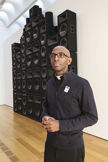 Father Desmond Drummer, pastor of Most Blessed Sacrament Church, Atlanta, and chaplain at Our Lady of Mercy High School, Fayetteville, stands before the artistic work of Nadine Robinson’s “Coronation Theme: Organon.” The speakers sound system and mixed media piece is connected to his reflection on Station Thirteen at the High Museum, Jesus Dies on the Cross. Photo By Michael Alexander