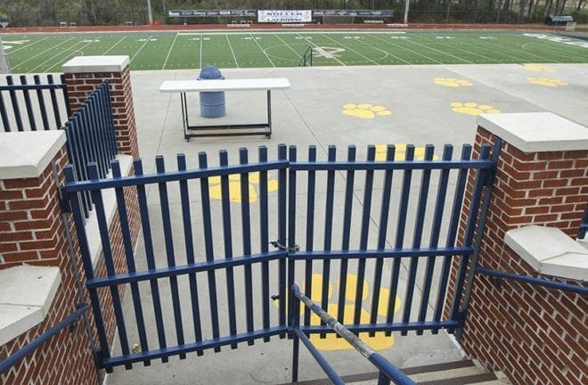 Since the closing of Atlanta Archdiocese schools for two weeks became effective, starting Monday, March 16, that also means all athletic activities, including games, practices and workouts were also suspended. A padlock secures the fence going to the stadium, where lacrosse and soccer matches are played and track meets are held at St. Pius X High School, Atlanta. Photo By Michael Alexander