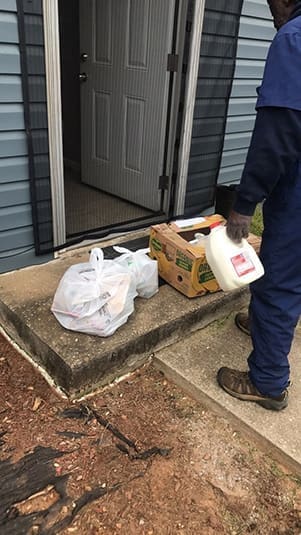 A St. Vincent de Paul volunteer leaves a food donation on a doorstep to help a family in need. The food drive, which occurred in late March and early April, served more than 80 households. Photo Courtesy of SVdP Georgia