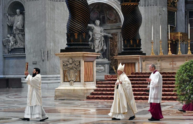 This year, the pope presided over the Mass in a vast and empty basilica with a handful of assisting deacons and priests, a reduced choir and a small congregation of about a dozen people, including Cardinal Angelo Comastri, archpriest of the basilica.