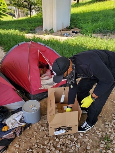 A CHRIS180 volunteer delivers a Compassion To-Go bag that contains shelf-stable food items for the homeless. The delivery is part of The Compassion Kitchen Project of the Cathedral of Christ the King.