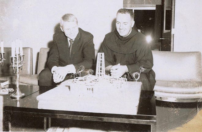 In this photo, first published in February 1967 in The Georgia Bulletin, Ed Steppe, president of Catholic Students at the University of Georgia, and Father Christian Malone, OFM, chaplain, look over a model of the chapel. Photo Courtesy of Archives, Archdiocese of Atlanta