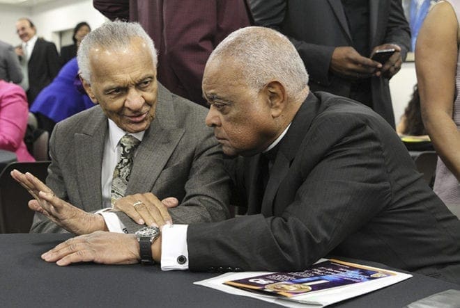 In this April 2018 photo, during the Martin Luther King Jr. Nonviolent Peace Prize Awards Luncheon, former Atlanta Archbishop Wilton D. Gregory, right, listens during a conversation with the 93-year-old Rev. C.T. Vivian. Rev. Vivian was a close friend and ally of Dr. Martin Luther King Jr. during the Civil Rights Movement. Photo By Michael Alexander