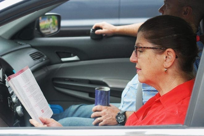 Karen and Kevin Young follow along during the responsorial psalm during a drive in Mass at the Gilmer County Civic Center on Aug. 30. Photo by Laura Moon