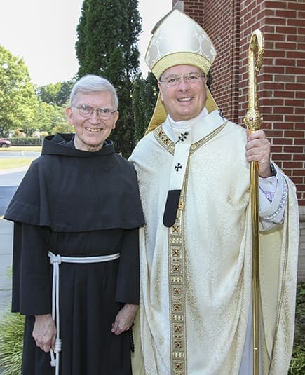 The minister provincial for the Franciscan Friars Conventual of Our Lady of the Angels Province, Father James McCurry, OFM Conv., left, was on hand for the Mass when Archbishop Gregory J. Hartmayer, OFM Conv., right, received his sacred pallium. Father McCurry resides in Ellicott City, Maryland. Photo By Michael Alexander
