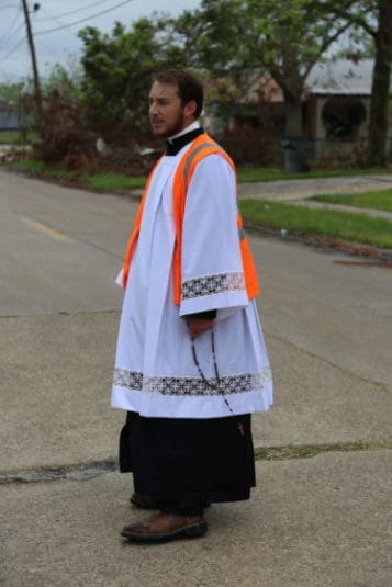 Atlanta seminarian Joseph Fiorentino prays the rosary during the eucharistic procession while watching for traffic in Lake Charles, La. Seminarians from Notre Dame Seminary helped residents affected by Hurricane Laura recently with spiritual and clean-up needs.