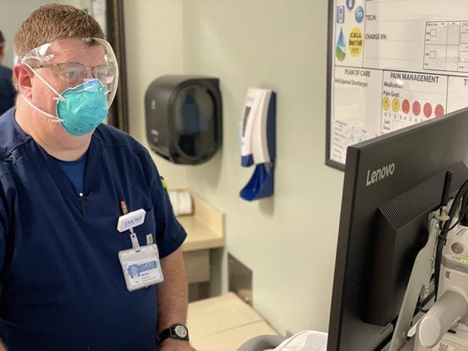 Jerry deVarennes, BSN-RN, works at a nursing terminal in the Cardiovascular Step Down Unit at Emory Saint Joseph Hospital, Atlanta, where he is the unit charge nurse. As a parishioner at Transfiguration Church in Marietta, he believes the vaccines serve as a sign of hope. Photo Courtesy of Emory Saint Joseph Hospital