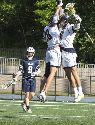 John Cote, left, celebrates with his Marist School teammate Andrew McLaughlin after Cote scored a goal in the first period of an April 22 lacrosse match against Pace Academy at Marist School’s Hughes Spalding Stadium. Photo By Michael Alexander