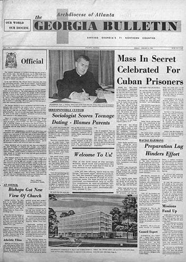 This is the front page of the first Georgia Bulletin, published on Jan. 4, 1963. The 1963 issues were scanned for the newspaper’s 50th anniversary in 2013. Historical issues of the local Catholic newspaper are now available online.