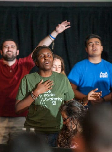 Young Catholics sing during praise and worship at a Friday evening Revive Track at the 2017 Eucharistic Congress in Atlanta. Photo by Thomas Spink