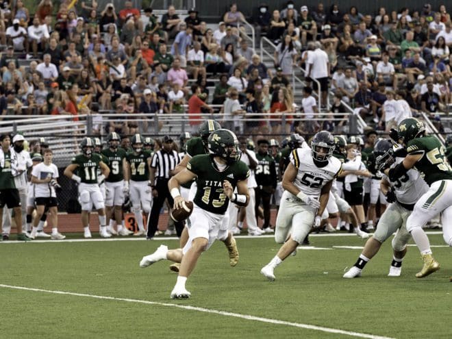 Blessed Trinity’s Senior quarterback JC French (#13), center, is on the move. Photo by Johnathon Kelso