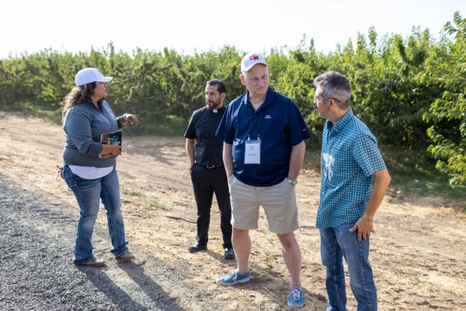 Msgr. Jim Schillinger of the Archdiocese of Atlanta, second from right, and Father Jesus Mariscal speak to representatives from Washington Farm Labor Association, an organization that supports seasonal and agricultural workers in the Pacific Northwest, as they prepare to visit the farm workers during Catholic Extension’s pastor immersion experience. Photo Courtesy of Catholic Extension
