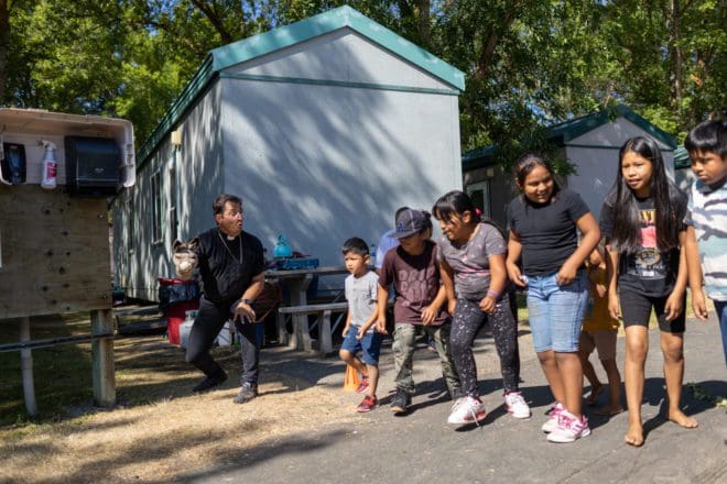Bishop Joseph Tyson of Diocese of Yakima, at left, visits and plays with children who are participating in the Literacy Wagon program. The diocese provides the educational resources to farm workers’ children with support from Catholic Extension. Photo Courtesy of Catholic Extension